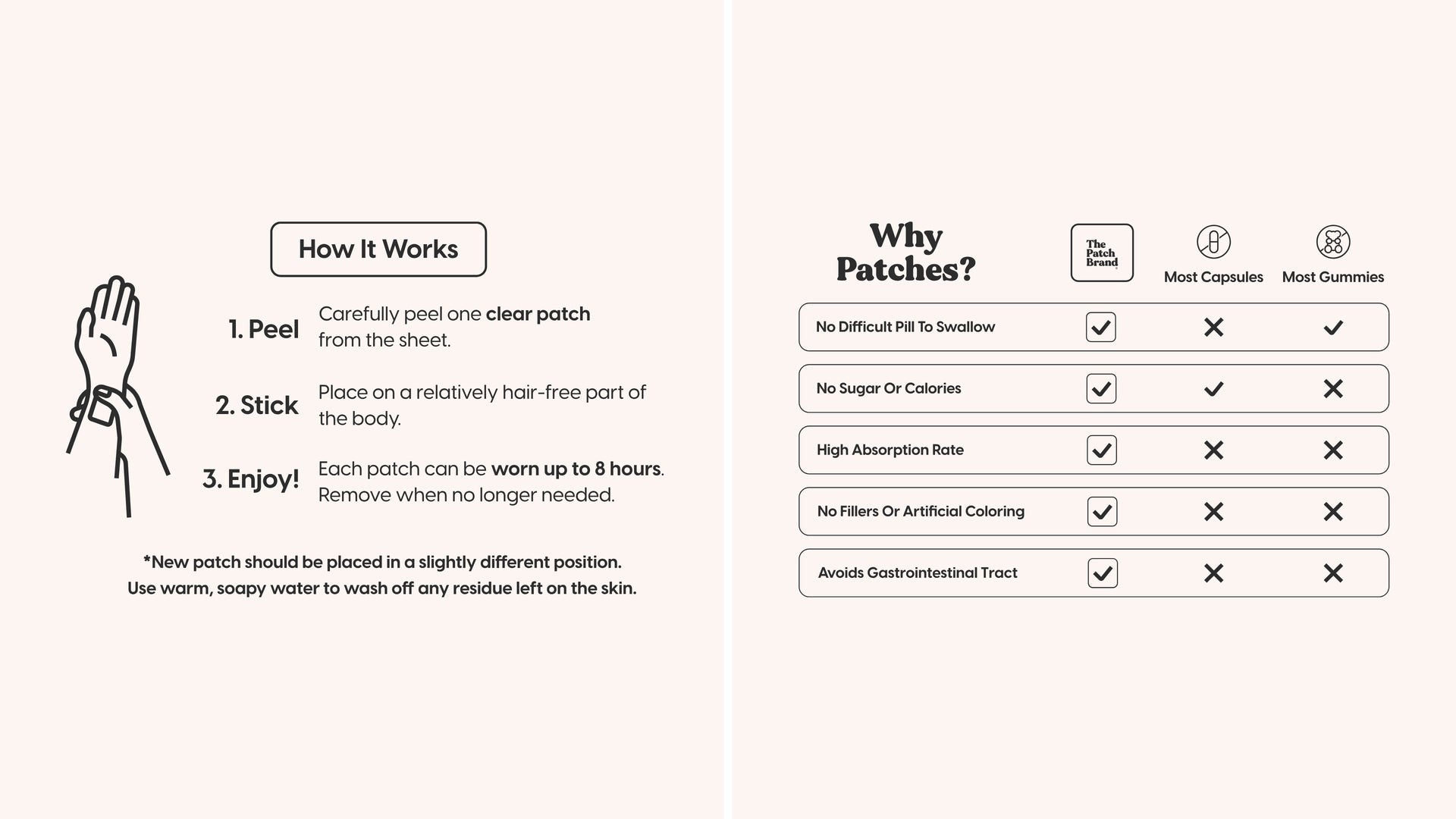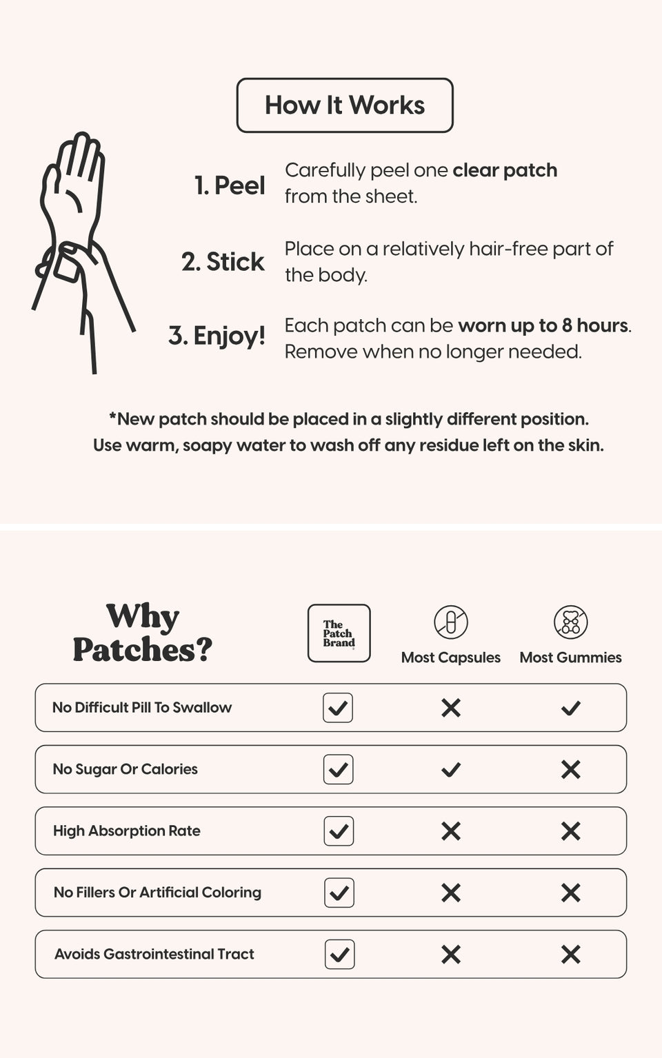 Enjoy! Remove when no longer needed. Each patch can be worn up to 8 hours.