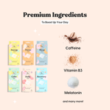 Sleep: 3 mg Melatonin, Valerian Root Extract (Valeriana Officinalis), Passionflower Extract (Passiflora Incarnate), Vitamin B2 (Riboflavin), Magnesium Citrate, Hops (Humulus Lupulus L. Extract), Vitamin D3 (Cholecalciferol)